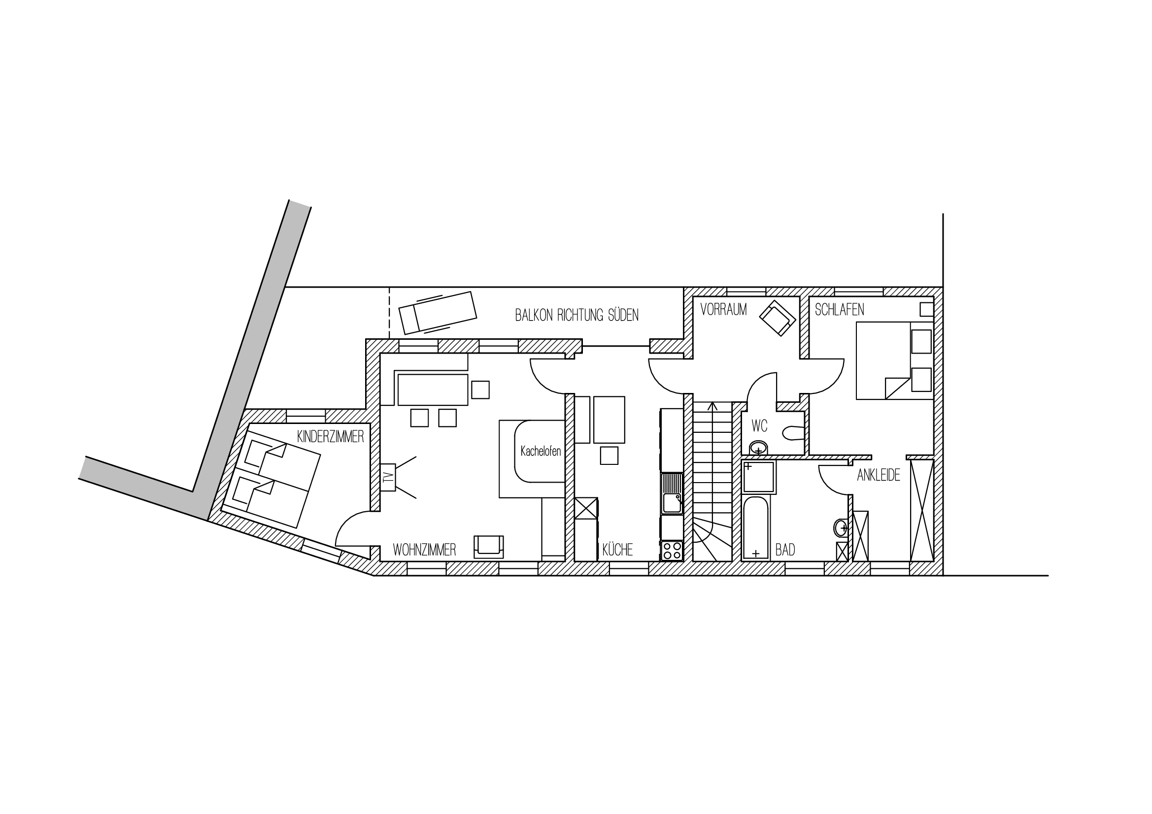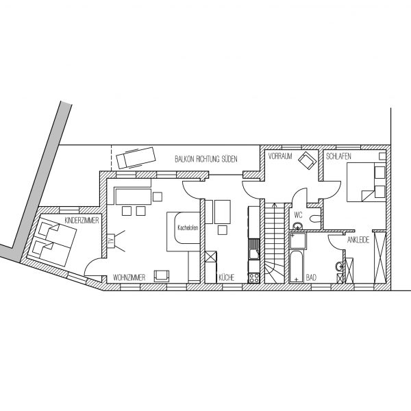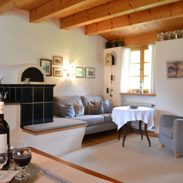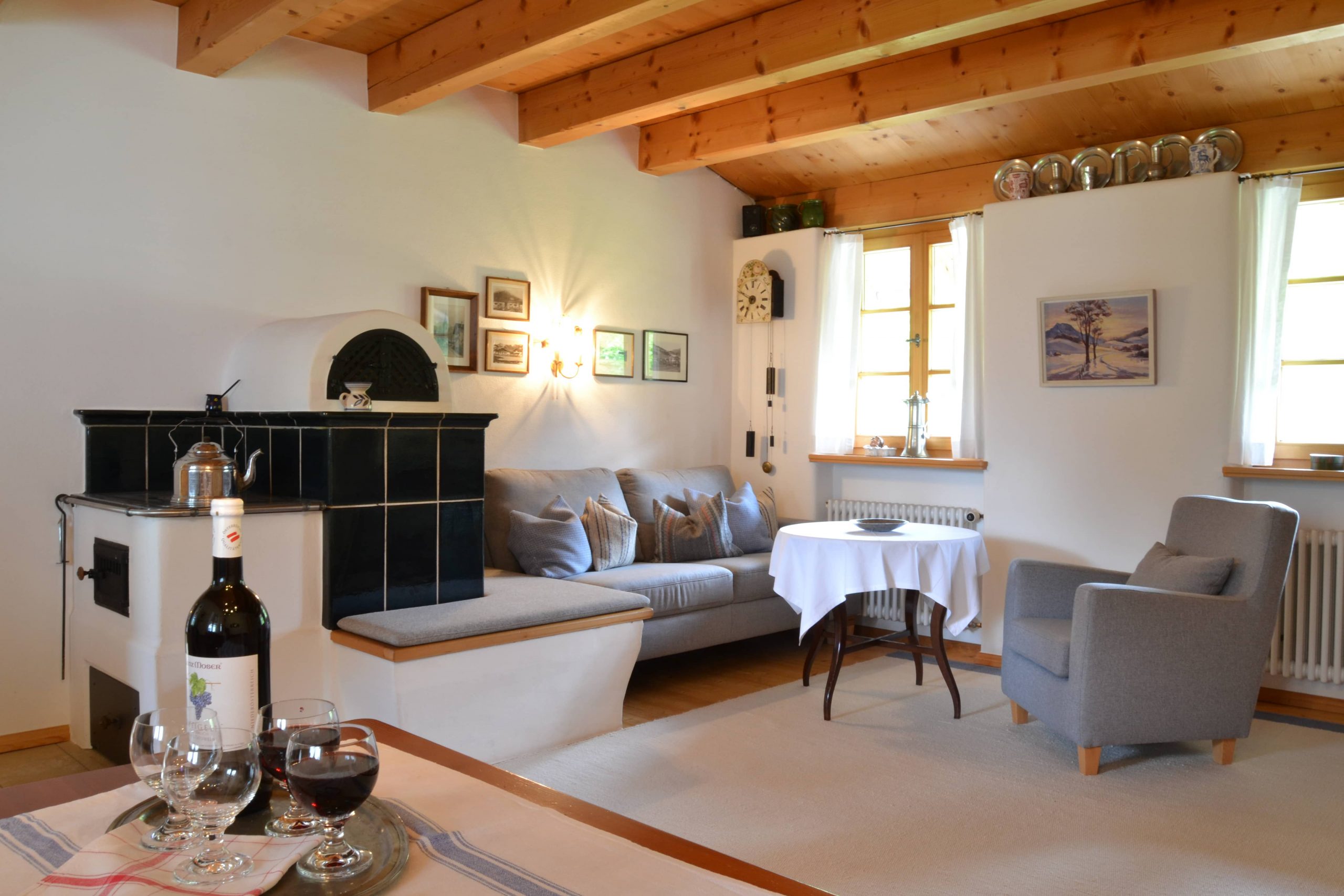 - Wohnzimmer mit Esstisch, Sofa, Sessel und Kachelofen