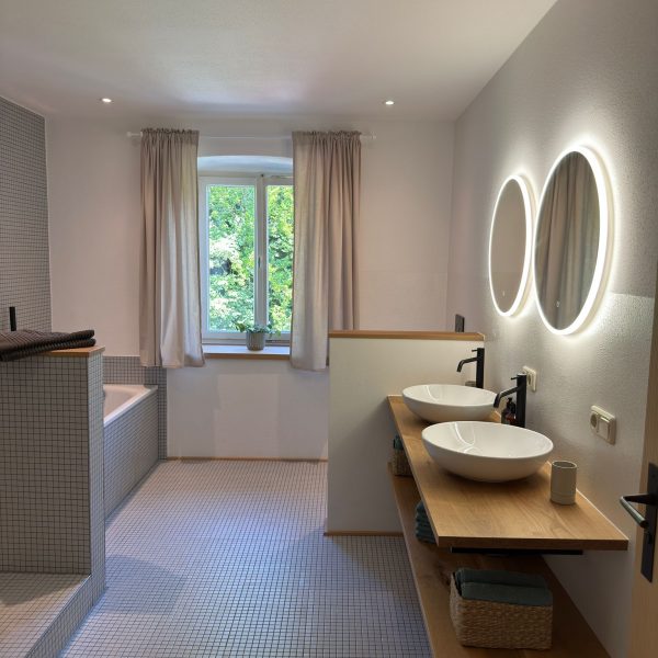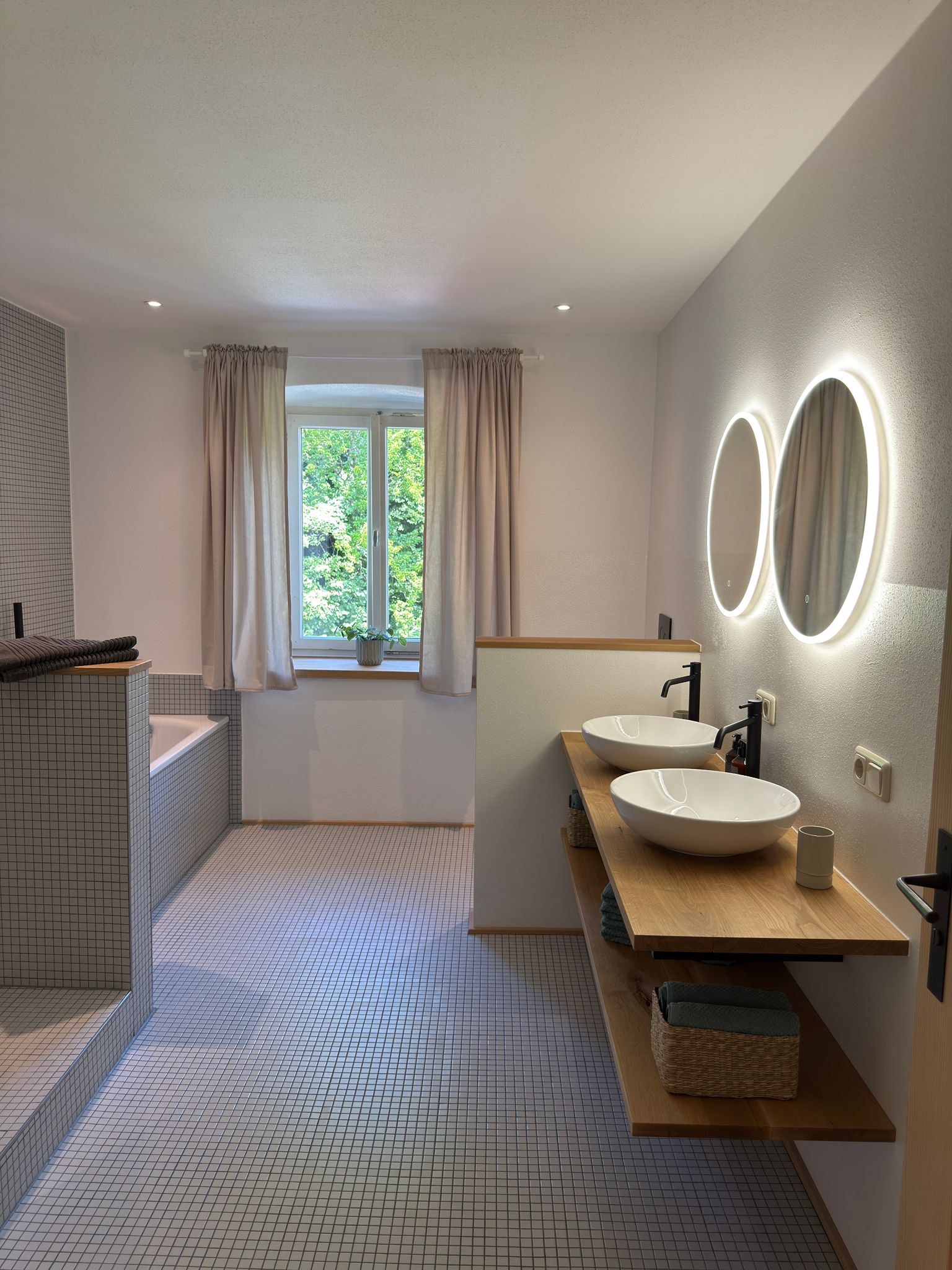• Ein stilvolles Badezimmer mit Badewanne und Dusche, WC, 2 Waschbecken und Haartrockner