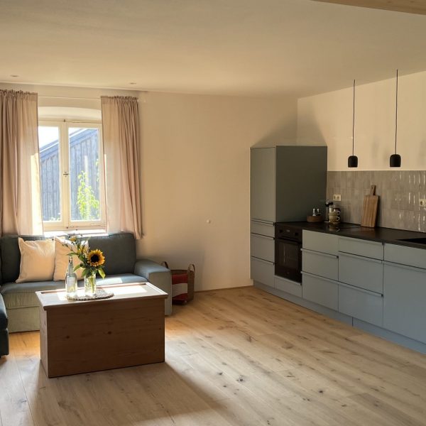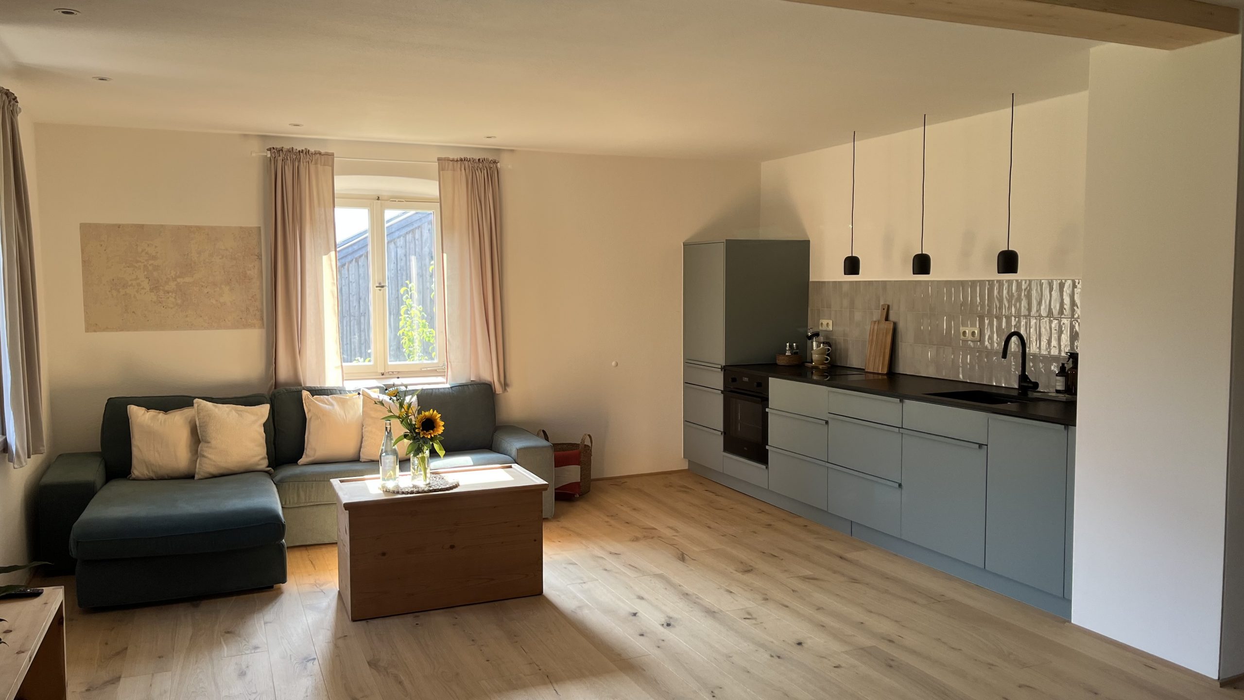 • Offene Wohnküche mit gemütlicher Cordcouch und großem Esstisch